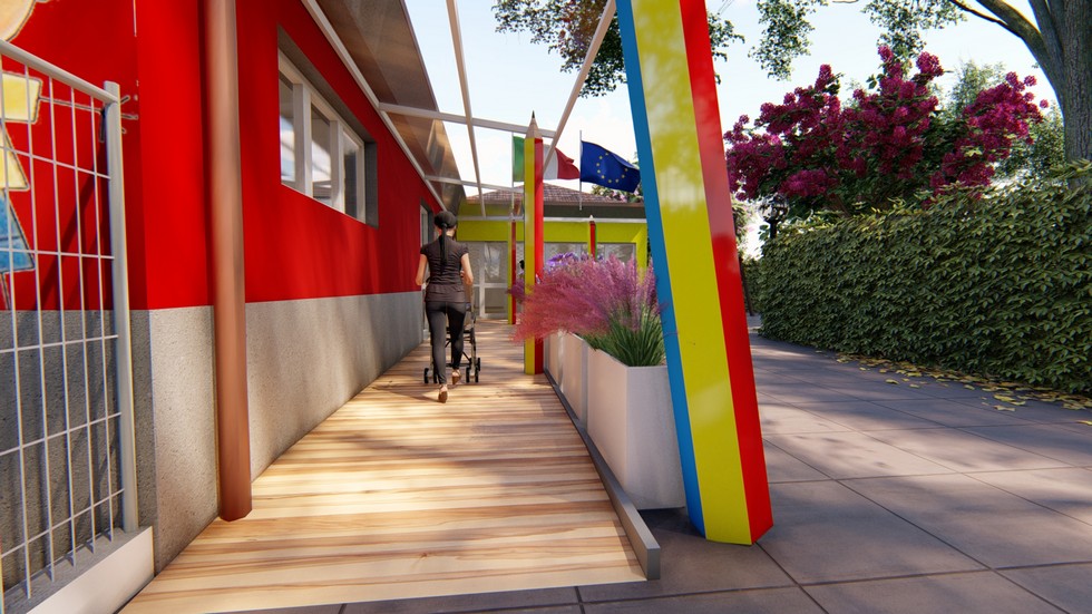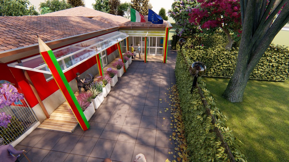 Durante la fase di progettazione, è emersa la necessità di fornire una copertura all’ingresso dell’asilo per proteggere dalle intemperie. La soluzione proposta è stata l’installazione di matitoni giganti, che oltre a sostenere la pensilina, hanno aggiunto un tocco di allegria e colore. Questa innovazione ha reso l’ambiente più accogliente senza compromettere la funzionalità della struttura.